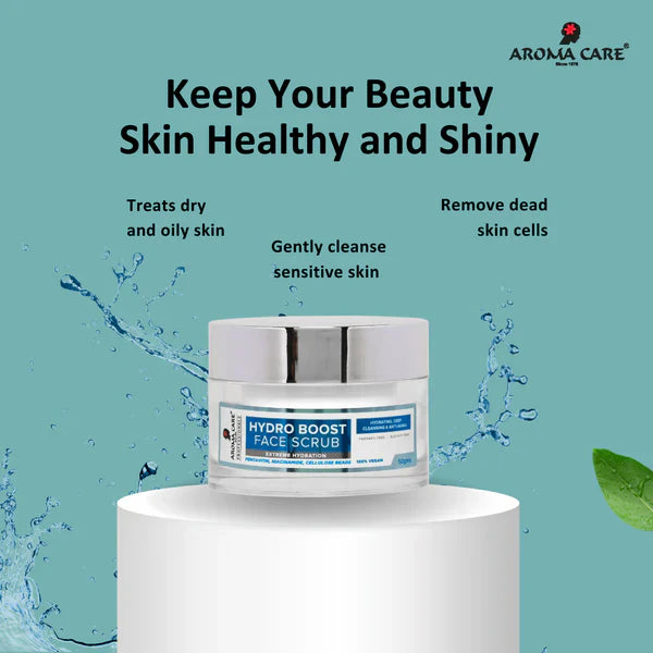 Goodness Inside : This Hydro Boost Face Scrub from Aroma Care is specially crafted with gentle and hydrating ingredients, including Pentavitin and Niacinamide. With the addition of cellulose beads, this scrub effectively removes dead skin cells, dirt, grime, and impurities while also promoting skin elasticity, reducing signs of aging, and brightening the complexion upon initial use.