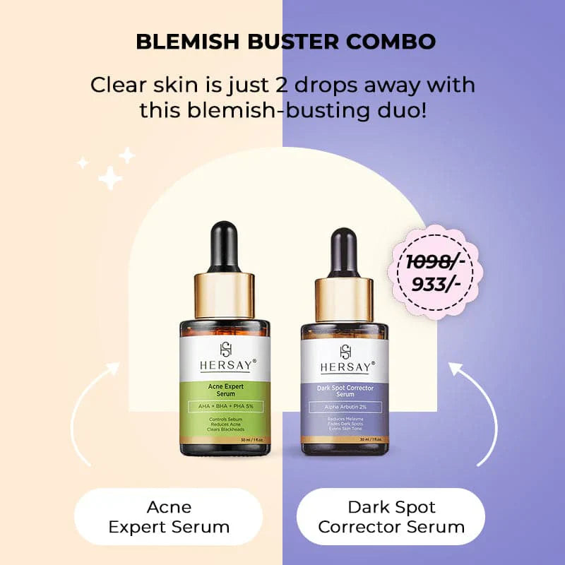 Say goodbye to blemishes with the Blemish Buster Combo, featuring the Dark Spot Corrector Serum and Acne Expert Serum. This combo targets dark spots, acne, and blemishes for clearer and healthier-looking skin.