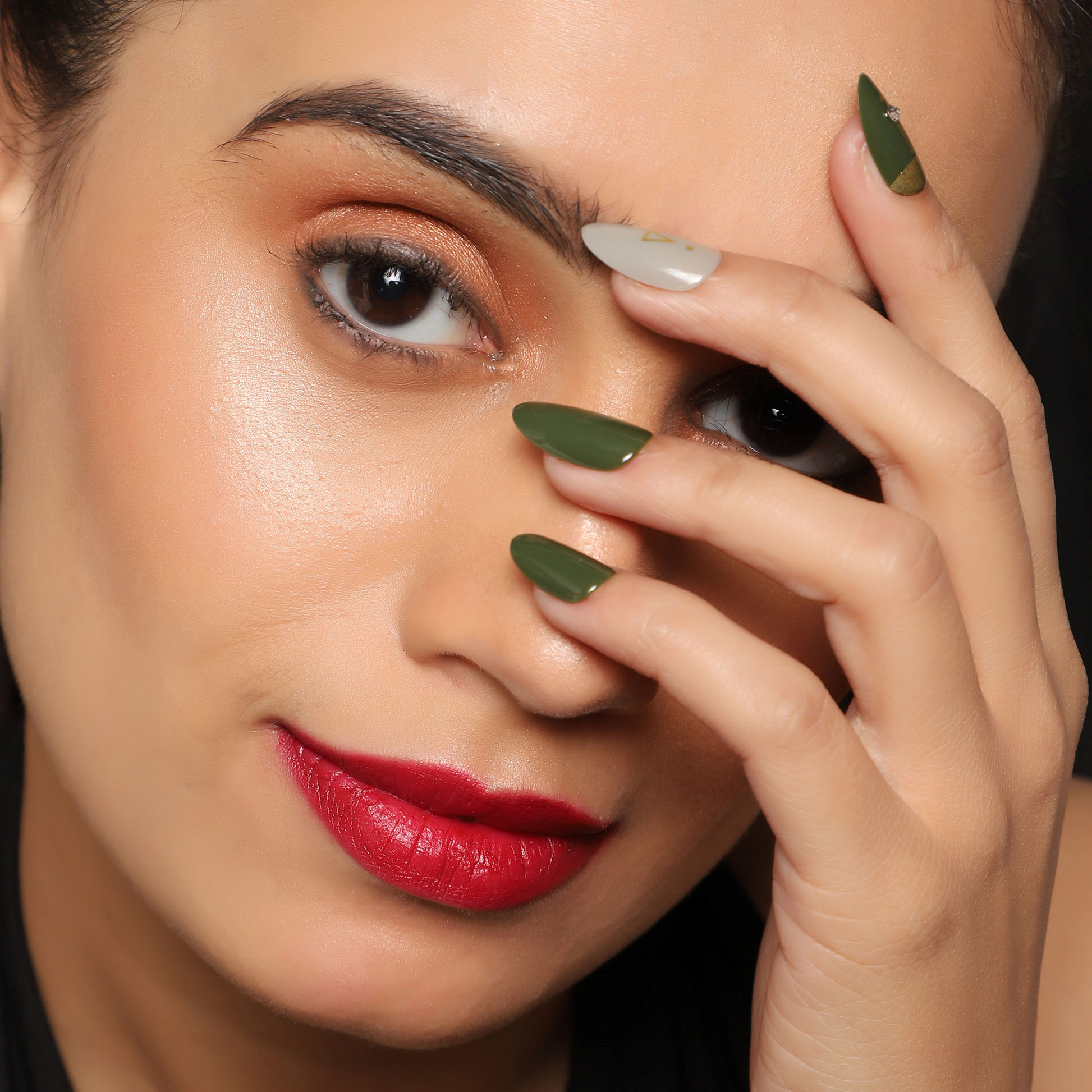 The best part about these olive green press-on nails is that it is super easy to carry with any outfit while still being bold and snap-worthy. 30 pcs dark olive green with a tint of pastel green and studs oval press on nails are apt for Mehndi function because they are most traditional, the most classic, and for good reason, too; they're timeless and elegant.