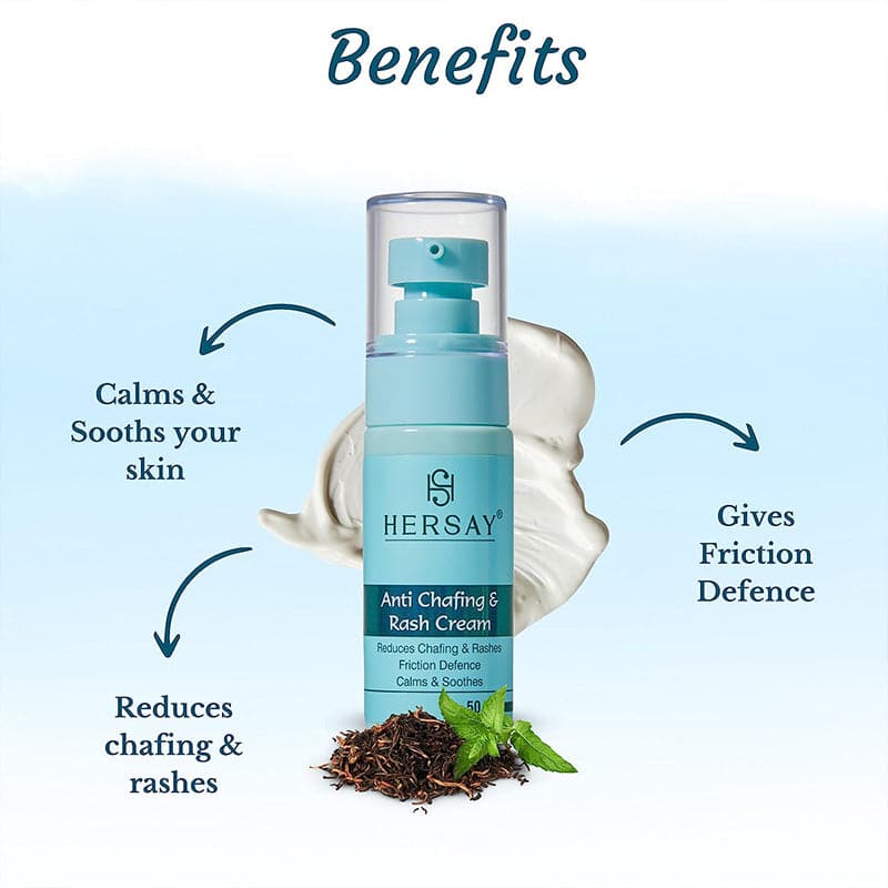 Hersay Anti-Chafing & Rash Cream’s unique natural & gentle formula eases the discomfort & provides relief from rashes, chafed, dry, itchy, irritated & inflamed skin associated with hair removal, intimate activity, sports activity as well as physical & environmental stressors. It also calms the burning and tingling sensations. It moisturizes, calms, sooths & nourishes parched, irritated & inflamed skin & leaves the skin calm, soft, smooth, supple and fresh.