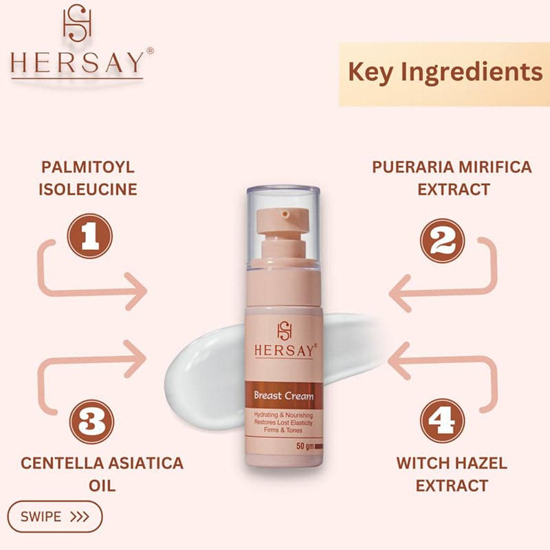 Hersay Breast Cream helps to reduce appearance of stretch marks, fine lines on & around breast area. It is enriched Sunflower Oil, Almond Oil, Vitamin E which offers hydrating and nourishing properties. Centella Asiatica Oil, Green Tea Leaf Oil, Pueraria Mirifica Extract, Fenugreek Extract helps to improve elasticity, firm & tone skin for a lifted look.