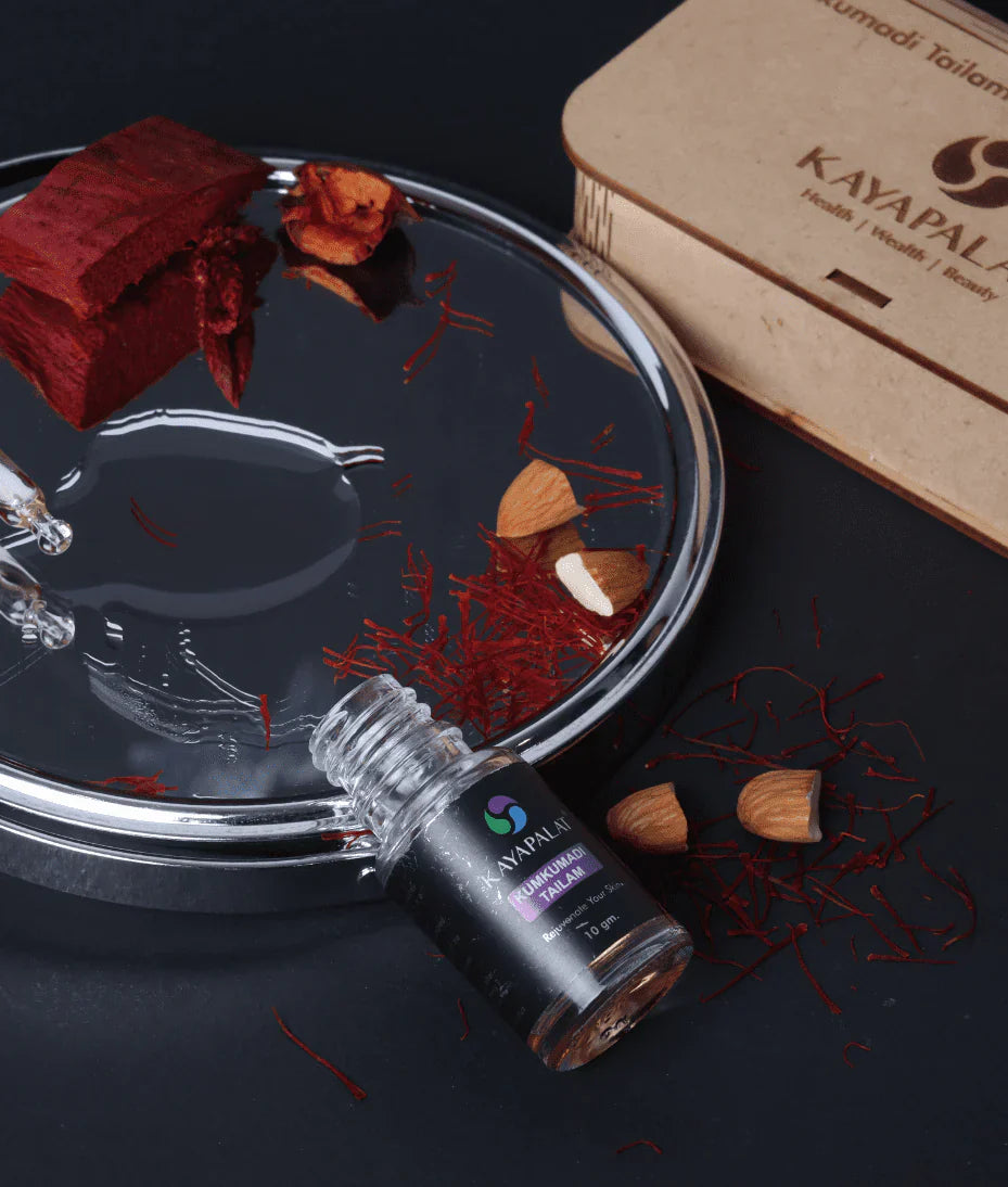 Experience the transformative effects of Kayapalat Kumudini Tailam, the natural saffron oil created through the Suryatapt method. Unveil a flawless complexion as this oil works diligently to eliminate blackheads, scars, mosquito bite marks, pimples, and blemishes. With just two drops each night, awaken to rejuvenated skin that exudes radiance and beauty.