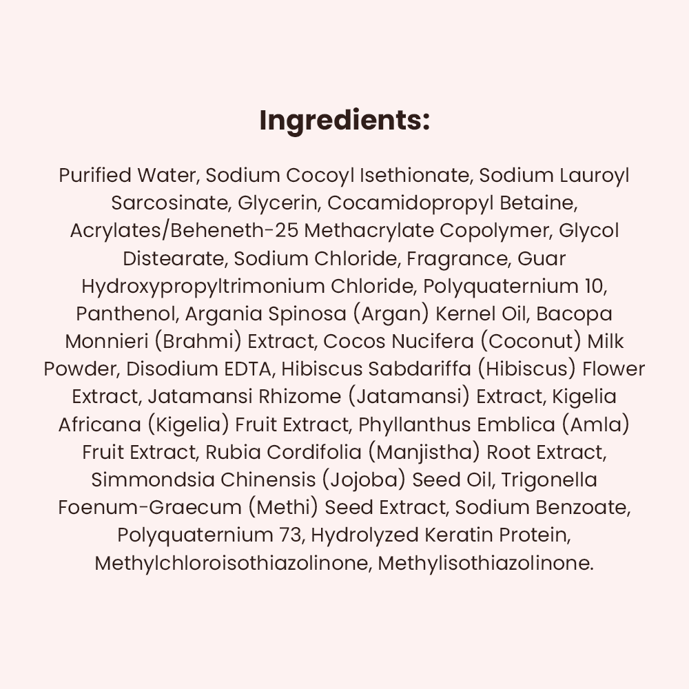 A gentle shampoo enriched with actives that hydrate the scalp and nourish the hair, including coconut extract - to rejuvenate scalp health, reduce hair breakage and to make hair shinier, brahmi extract - to strengthen hair roots, argan oil - to reduce hair loss and for sun protection, hibiscus flower extract and jojoba seed oil - to add volume and reduce frizz and dandruff, amla - to stimulate hair growth and to extend a softer hair texture, manjistha - to prevent premature greying, methi seed extract - to revive damaged hair and to control scalp inflammation.