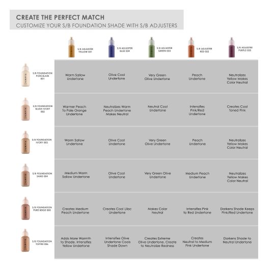Create more shades for more perfect skin tone matches with this seven shade set of S/B Shade Adjusters.